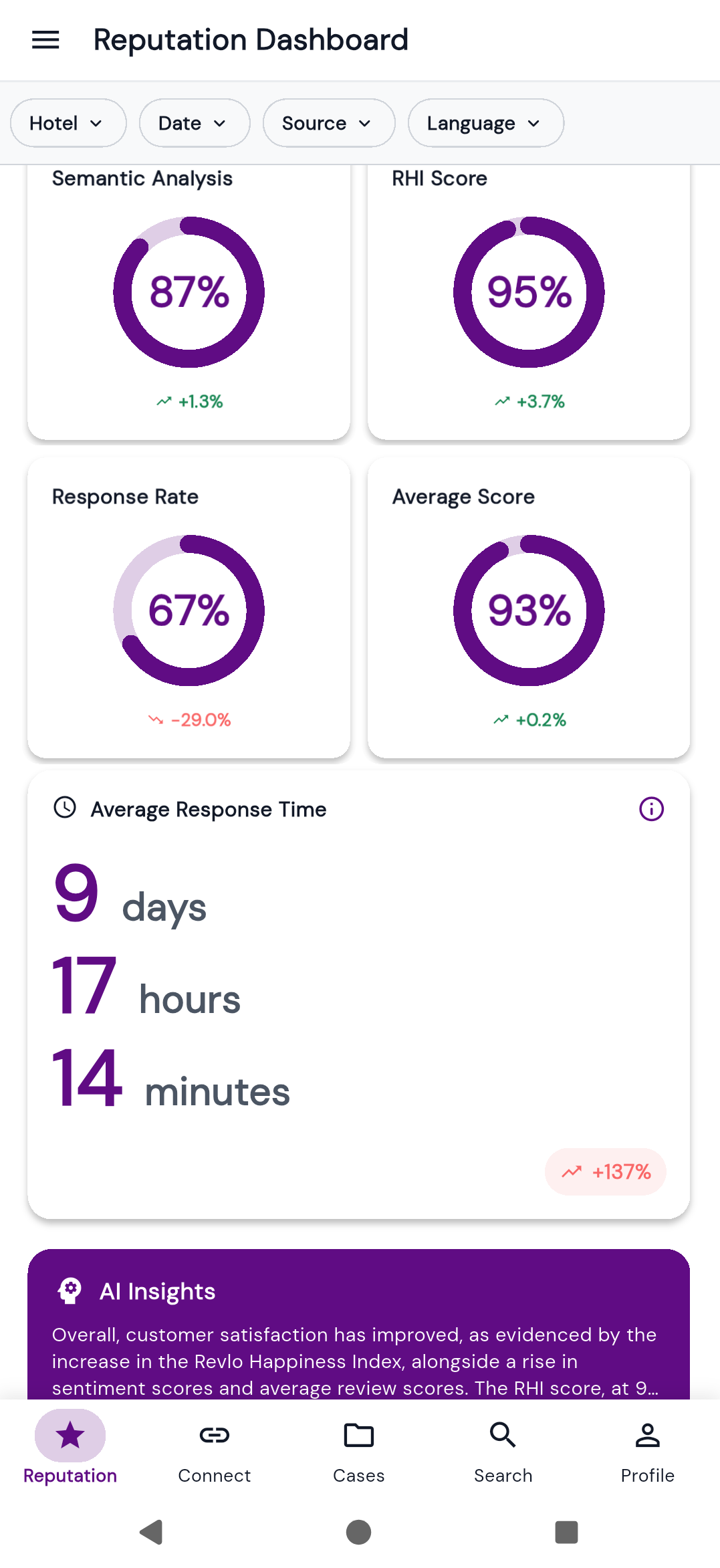 Thanks to Revlo, we’ve achieved remarkable improvements in our communication performance. With Revlo, our average response time dropped from over 65 days to just 15 days, with some channels seeing a speed increase of up to 835%. Review counts surged, growing by 49.6% in one area and up to 441% in another. We’ve gone from 2,716 to 4,064 reviews, These results show how Revlo helps us respond faster, engage more guests, and boost satisfaction across all our channels.
